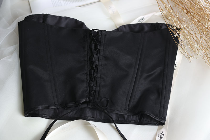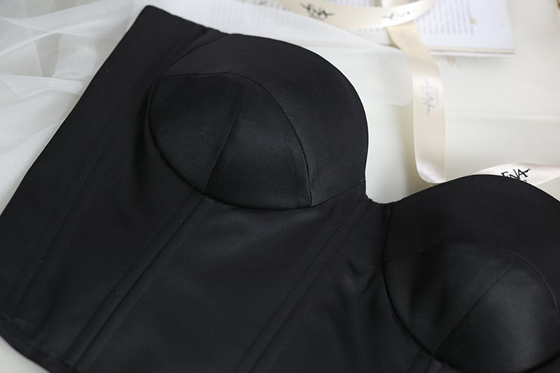 Bustier de satén negro forrado con poliseda, elaborado con técnicas de
